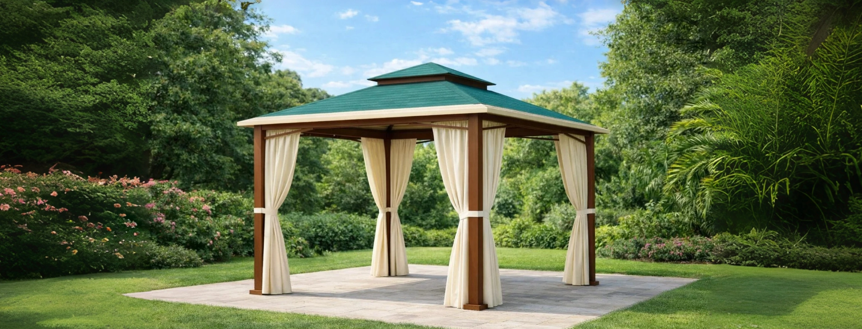 Stabiler Pavillon mit pulverbeschichtetem Stahlrahmen und wetterbeständiger Bespannung. Geeignet für Garten, Terrasse oder Außenbereiche.